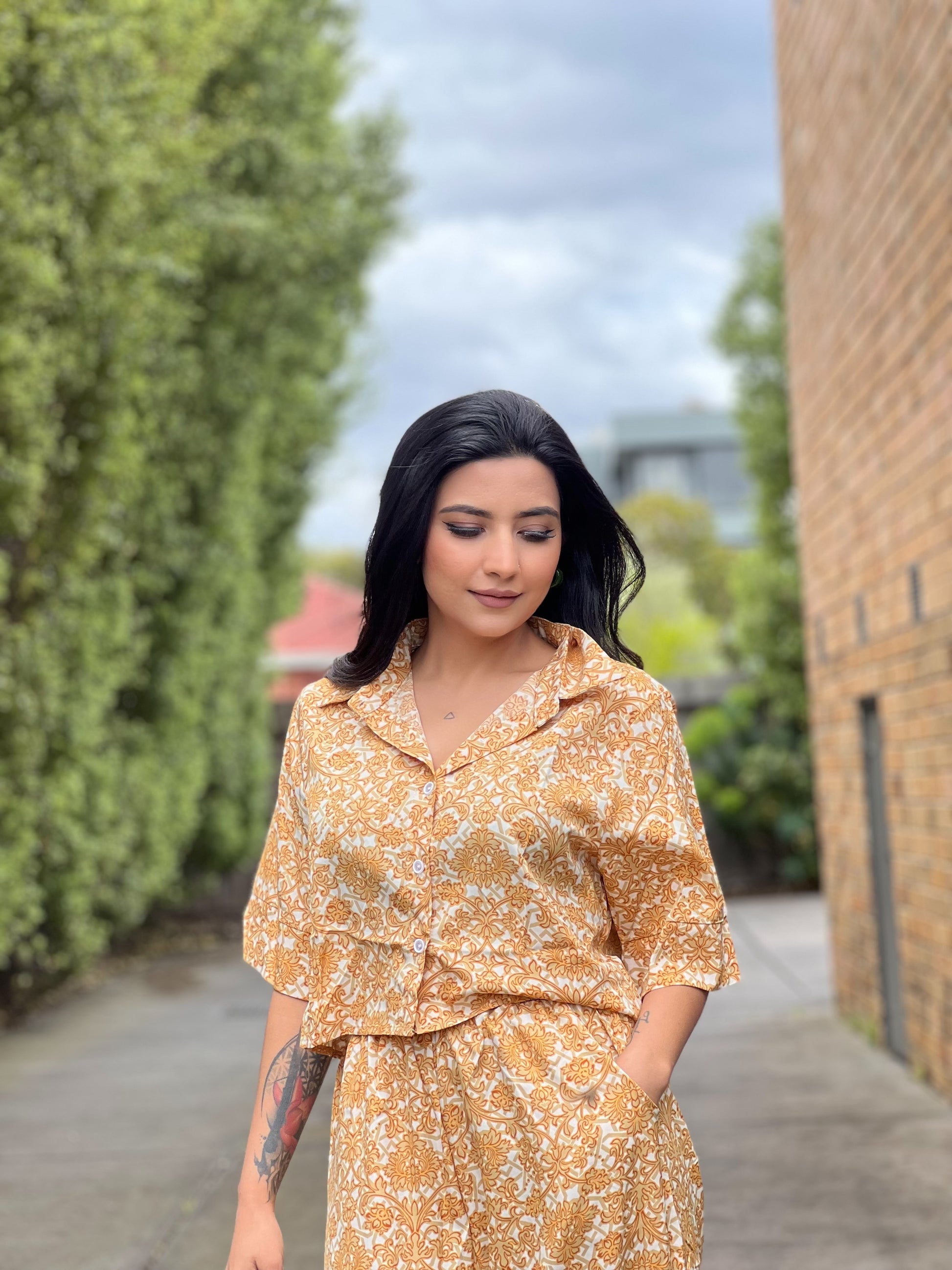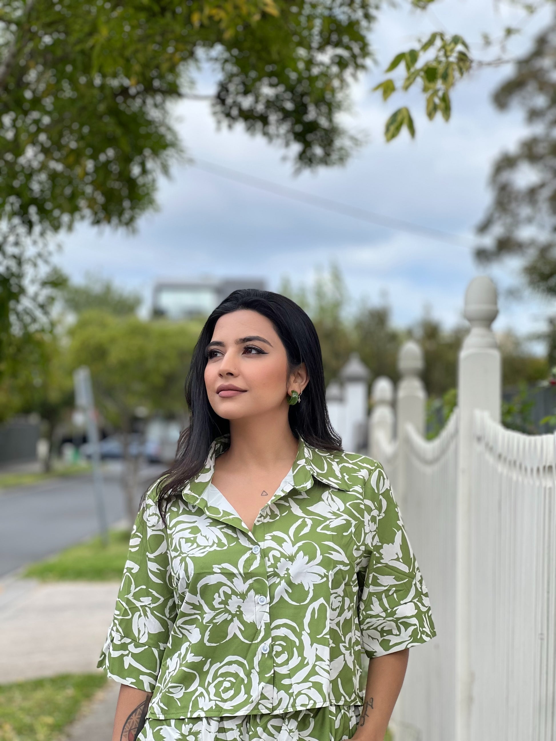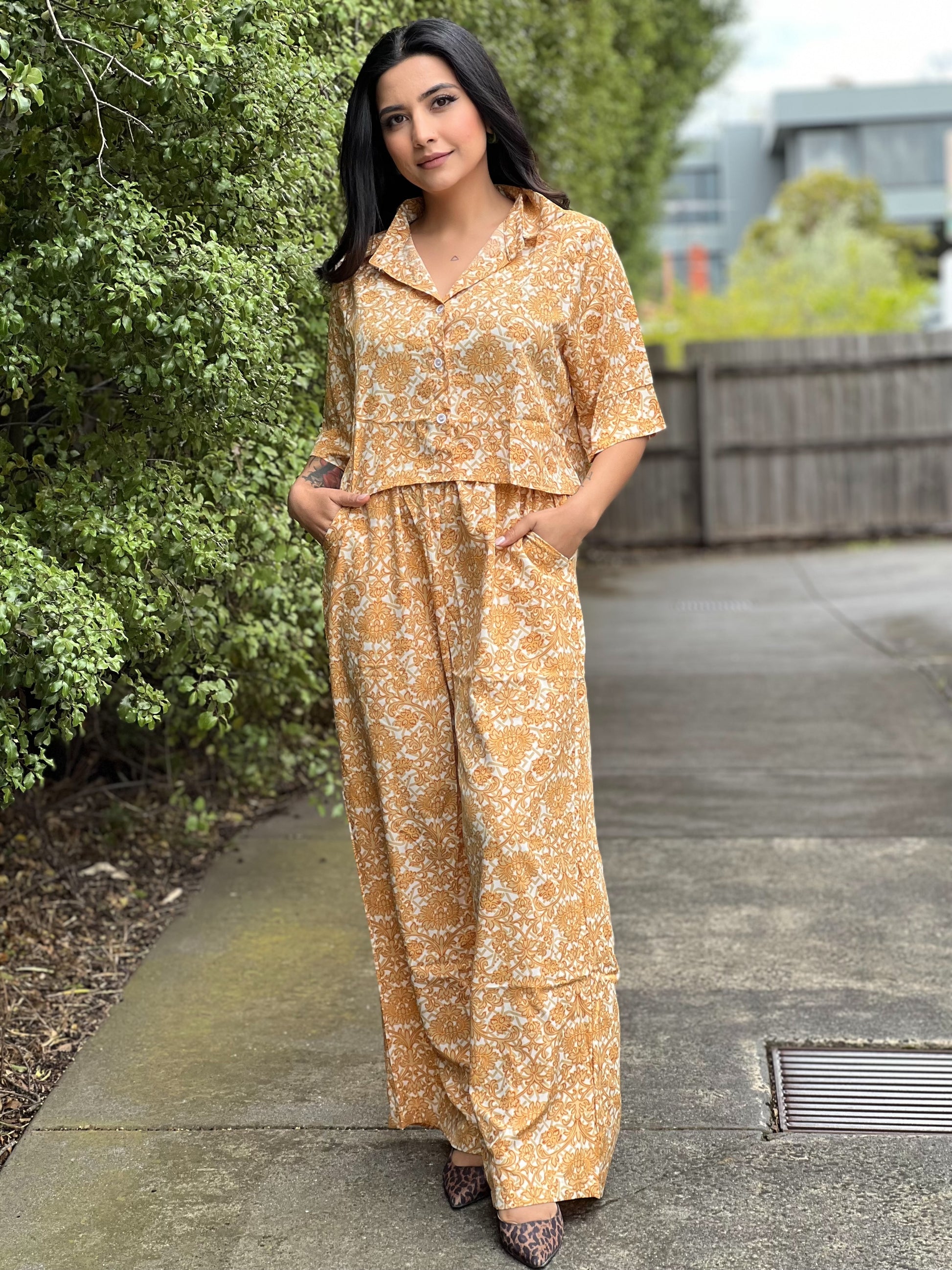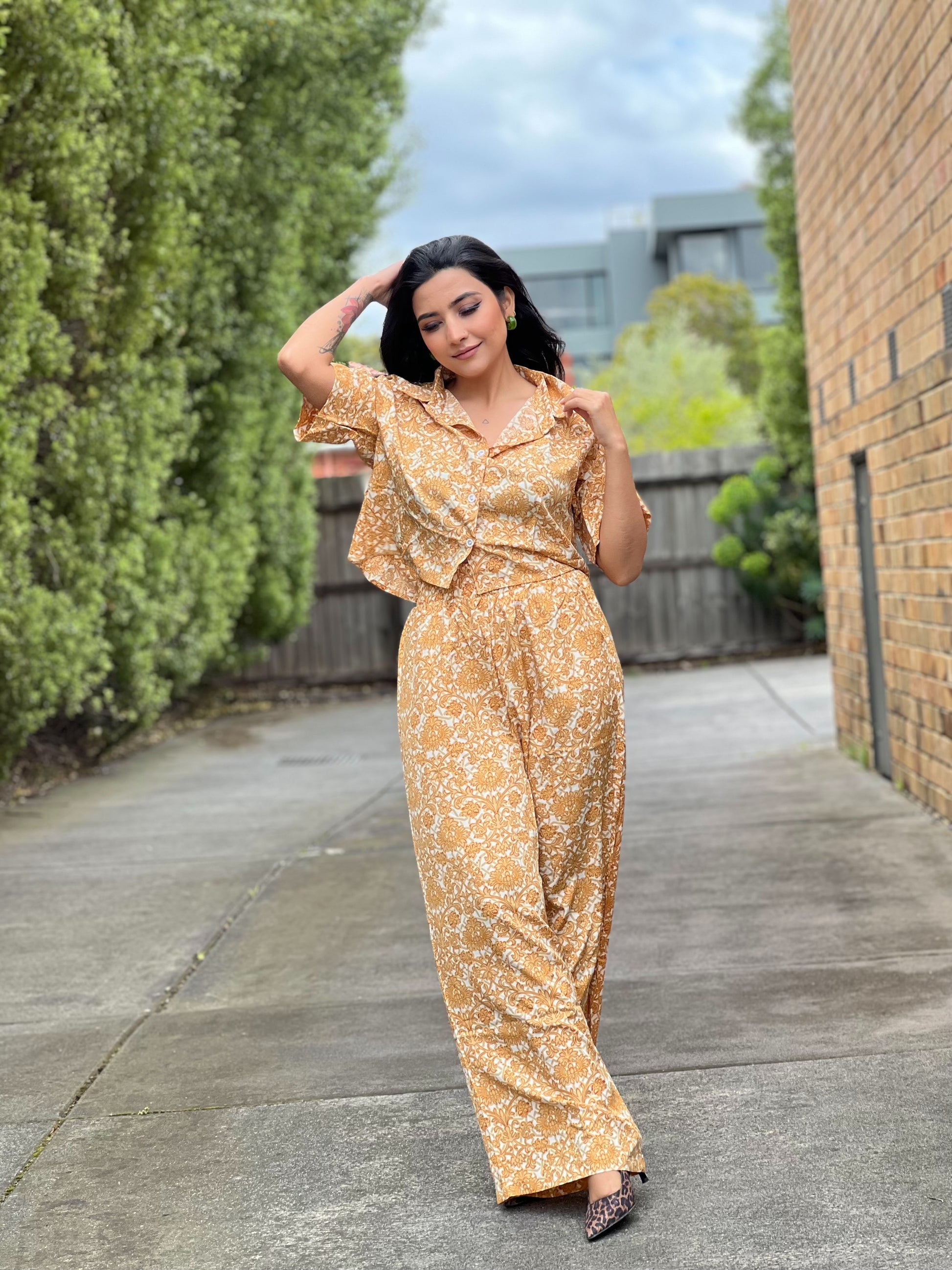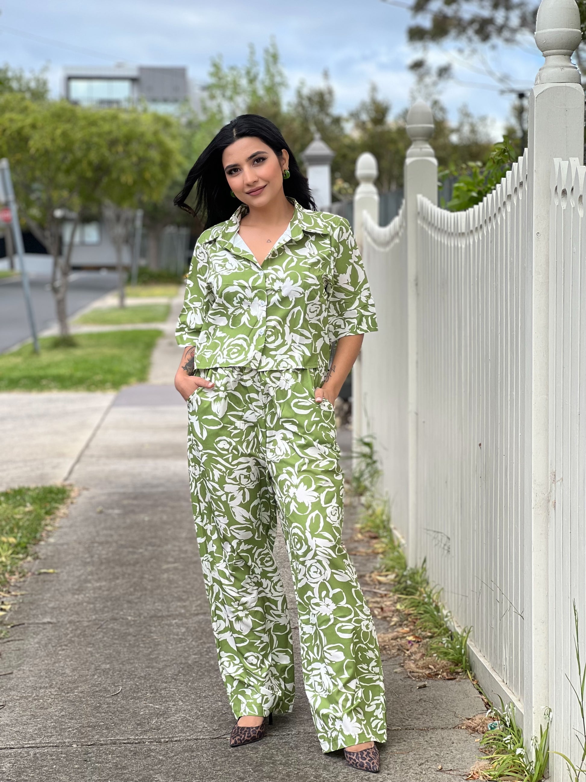 Vacation Casual printed short sleeve and wide leg straight pant.