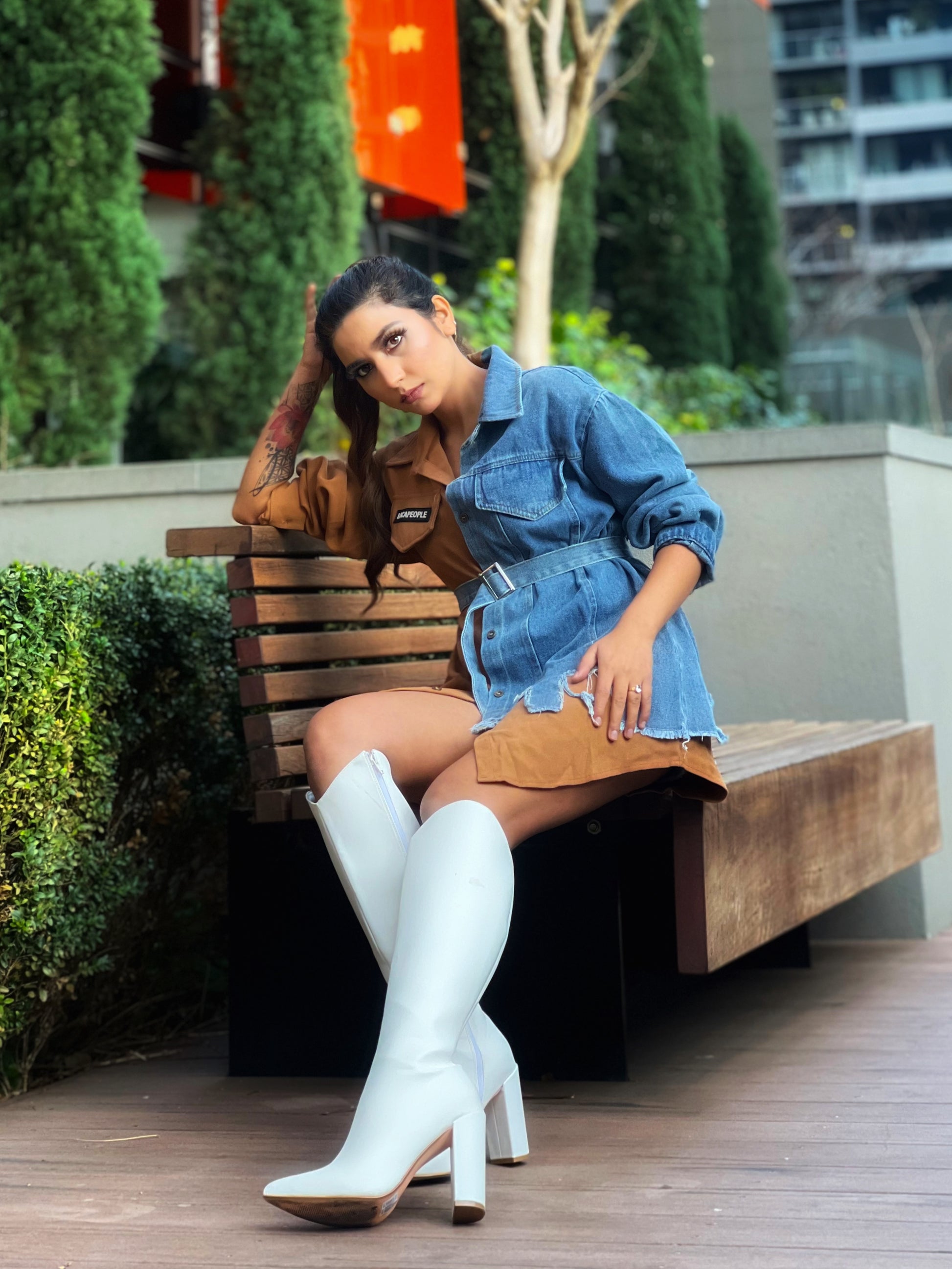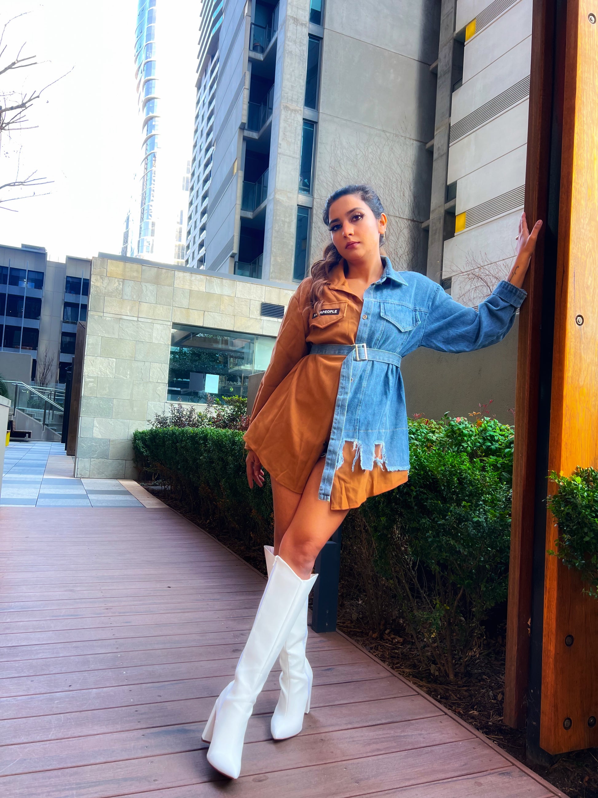Shirt style dress (half denim + half cotton twill) with belt attached. Can be worn as shirt or made a dress. One size fits all