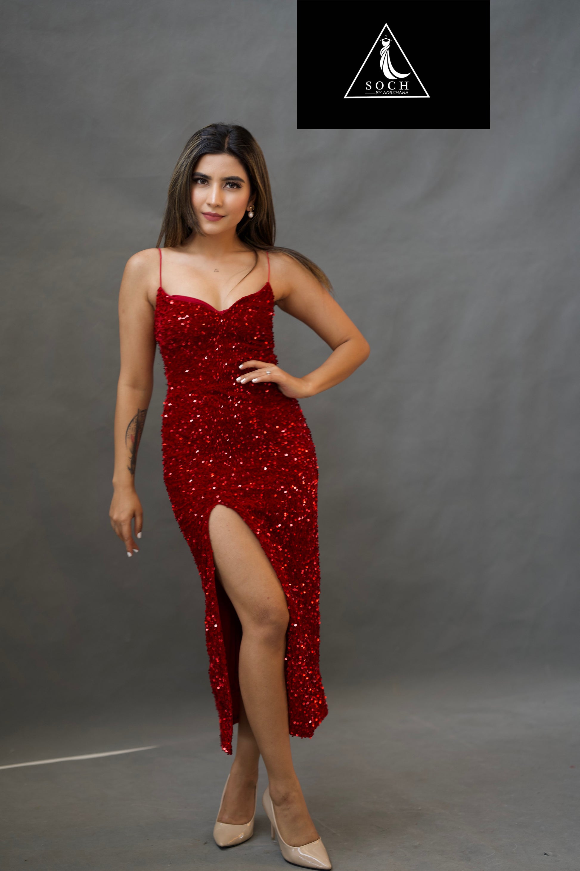 Velvet Sequence bodycone dress. Model in the picture is wearing size small. All sizes are as per asian size.